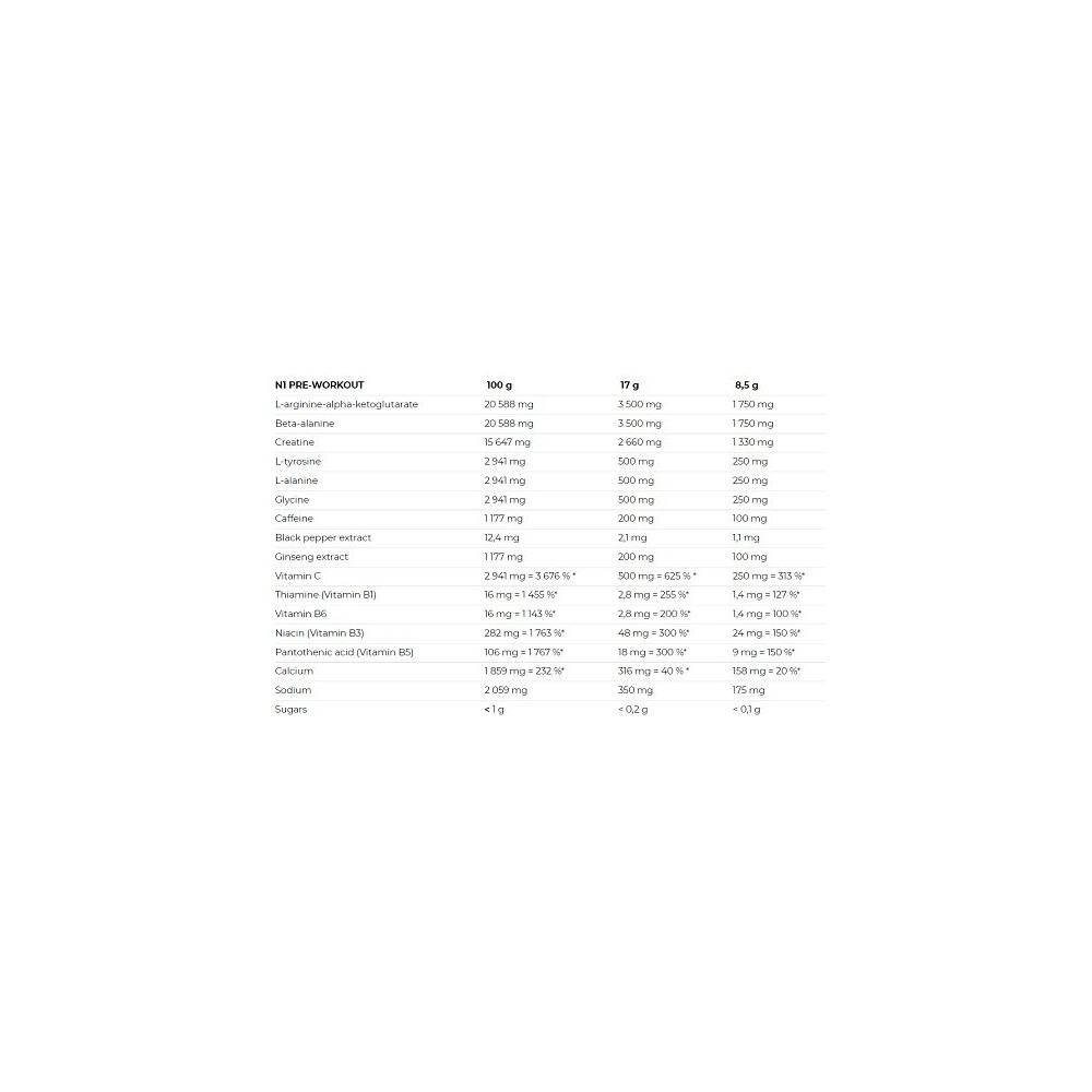 Ein professionelles Produkt zur Stimulierung des Körpers vor körperlicher Aktivität, das nach den maximalen Möglichkeiten der europäischen Gesetzgebung hergestellt wurde. Es enthält wirksame, von der Fachwelt anerkannte Substanzen, die eine maximale Wirkung beim Aufpumpen der Muskeln garantieren und die Grenzen der körperlichen Leistungsfähigkeit verschieben. Das neue Pre-Workout N1 ist sowohl für Kraft- als auch für Ausdauerleistungen konzipiert und gibt Energie und Kraft während der gesamten sportlichen Aktivität. Für alle Athleten stellt N1 eine Quelle neuer Kraft, Energie und vor allem ein großartiges Gefühl dar, das sich aus dem absolvierten Training ergibt.