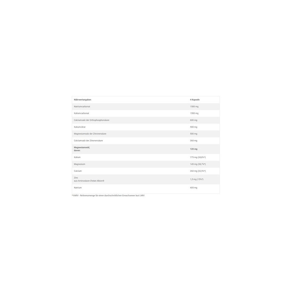 Natriumcarbonat, Kaliumcarbonat, Calciumsalz der Orthophosphorsäure, Kaliumcitrat, Magnesiumsalz der Zitronensäure, Calciumsalz der Zitronensäure, Magnesiumoxid, Füllstoff (Mikrokristalline Cellulose), Trennmittel (Magnesiumstearat), Zinkbisglycinat, Kapsel (Gelatine, Farbstoff: E 171).