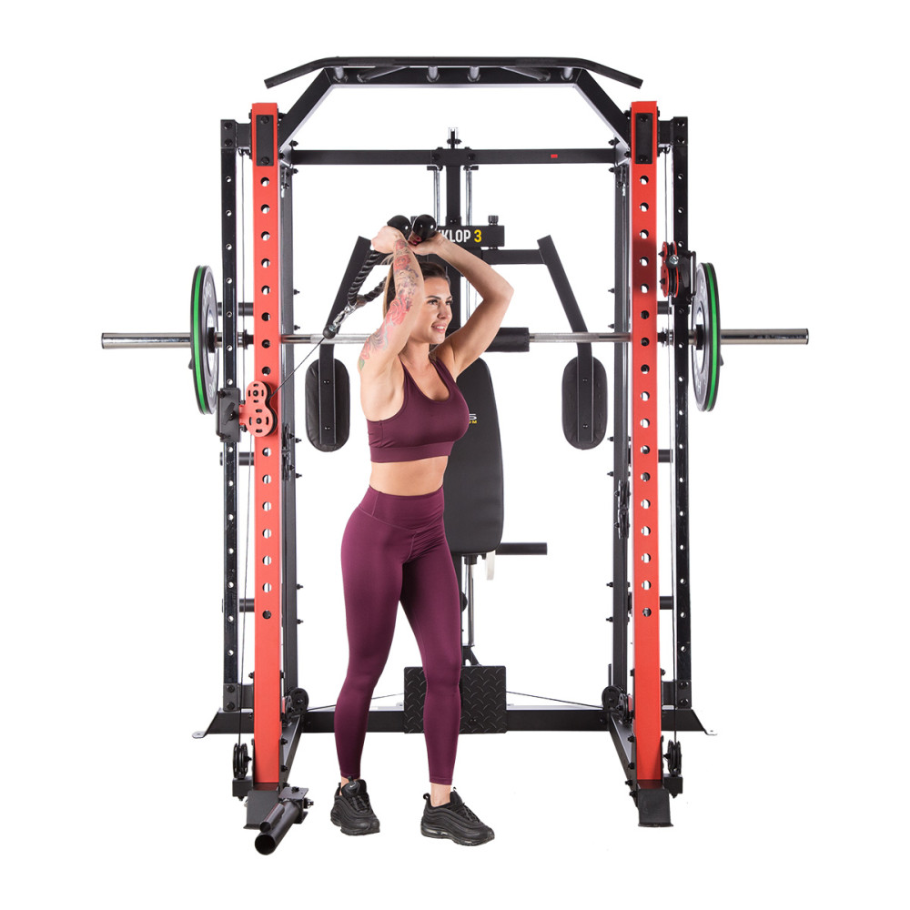 CYKLOP 3 bietet viele Annehmlichkeiten den Trainierenden an, u. a.: Trainingsbank, schnelle Höhenverstellung der Latzug-Station. Eine spezielle Rolle aus Schaumstoff schützt hingegen den Trainierenden bei Kniebeugen. Die Handgriffe der Klimmzugstange sind gerändelt, um die Griffigkeit zu erhöhen. Die weiche Rückenlehne der Trainingsbank und Butterfly-Station werden ein langes und bequemes Training gewährleisten. Um Hantelscheiben richtig aufzubewahren, hat der Benutzer einen funktionell vormontierten Ständer mit einer Federverschluss zur Verfügung.